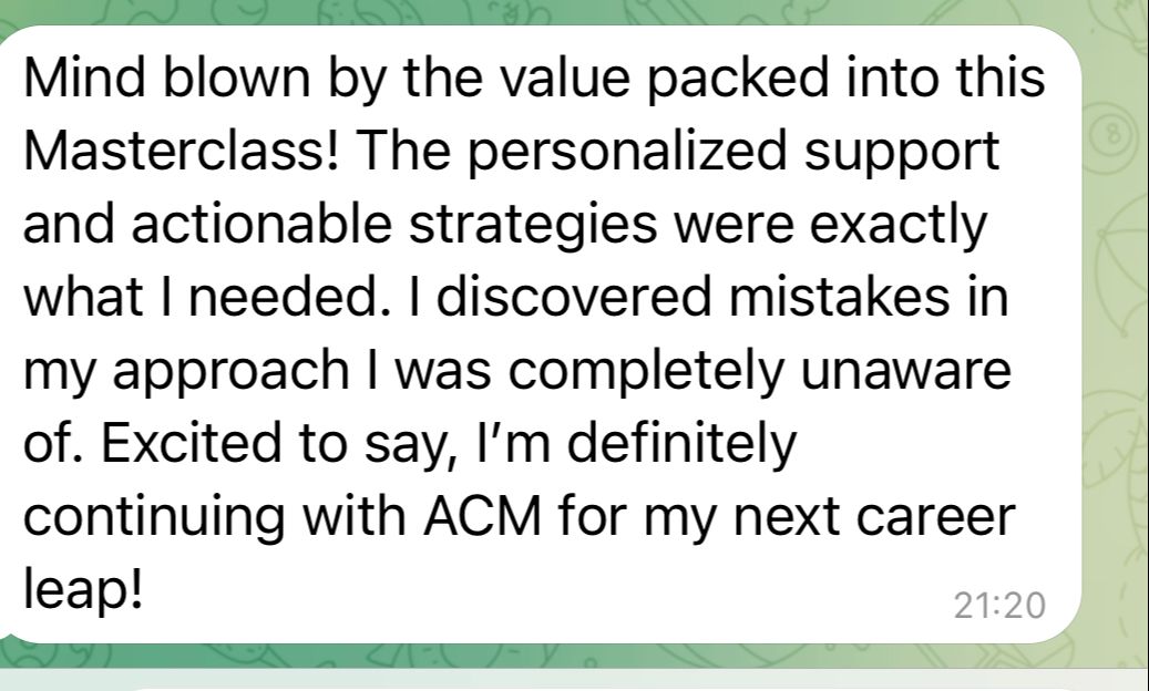 As a Career Growth Strategist & Coach, I've transitioned from a high-flying finance professional to a successful six-figure business owner and the creator of the Aligned Career Mastery™ System (ACM).